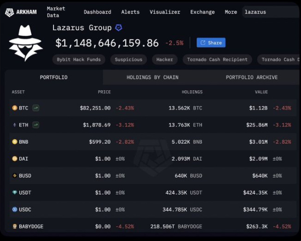 The Lazarus Group, which was responsible for the recent $1.5 billion Bybit hack, now holds 13,518 BTC worth $1.13 billion, according to Arkham Intelligence.