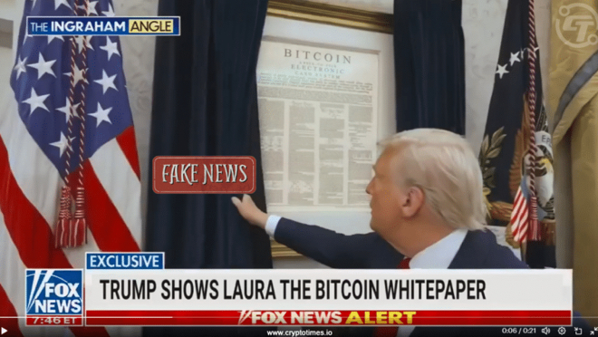 In reality, the video is fake. What we have here is a doctored version of a Fox News segment from The Ingraham Angle, where Trump is showing Sarah the United States Declaration of Independence. It is not the Bitcoin whitepaper.