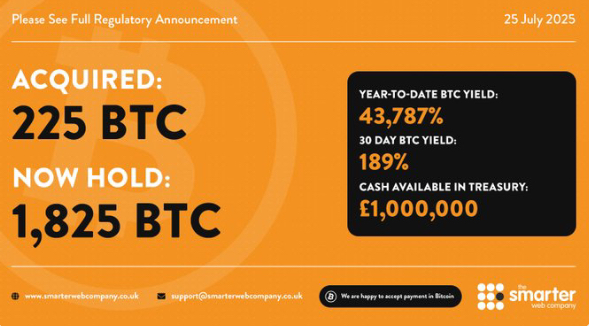 The 225 BTC were acquired for £19,596,574 ($26.5 million), at an average price of $118,076 per bitcoin. This latest purchase increases the company’s total bitcoin holdings to 1,825 BTC, with the cumulative average purchase price now standing at $109,088 per bitcoin.